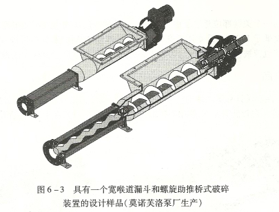 在輸送如此高黏度液體時(shí)的大挑戰(zhàn)是物體(看起來(lái)很難象流體)到達(dá)并進(jìn)入泵吸人口的能力。在這種情況下,用特殊的螺旋推進(jìn)器和寬喉道漏斗幫助流體進(jìn)入到泵中,以預(yù)防斷流。圖6 -3舉例說(shuō)明了這種設(shè)計(jì)。