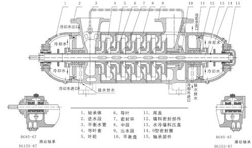 次高壓泵一般采用滑動(dòng)軸承、稀油潤滑結(jié)構(gòu),DG85-6 7、DG155-67型泵可采用滑動(dòng)軸承、 稀油潤滑,也可采用滾動(dòng)軸承、干油潤滑結(jié)構(gòu),其余型號均采用滾動(dòng)軸承、干油潤滑結(jié)構(gòu)。中、低壓泵的主要零件材料一般采用優(yōu)質(zhì)鑄鐵,次高壓泵主要零件采用鑄鋼或不銹鋼。該系列泵通過彈性聯(lián)軸器由原動(dòng)機(jī)直接驅(qū)動(dòng),從原動(dòng)機(jī)方向看,泵為順時(shí)針方向旋轉(zhuǎn)。