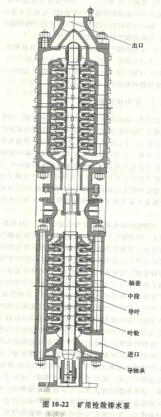 礦用搶險(xiǎn)泵的主要特點(diǎn)是流量大、揚(yáng)程高、功率大、機(jī)組重、尺寸大,其中又以揚(yáng)程高為主要的特征。因?yàn)閾P(yáng)程高,泵必須采用很多葉輪的多級(jí)離心泵形式。很多葉輪分上下兩組,兩組葉輪相向?qū)ΨQ布置。每組中的葉輪及其對(duì)應(yīng)的導(dǎo)葉套裝在主軸上并對(duì)應(yīng)壓入中段內(nèi),導(dǎo)葉位于葉輪與中段之間,導(dǎo)葉與中段固定連接,葉輪與主軸采用鍵連接,多個(gè)中段及集水段均套裝在主軸上。壓裝有上組葉輪的中段,集水段及壓裝有下組葉輪的中段經(jīng)拉緊螺栓連為一體,中間集水段位于上組葉輪的出口位置,反導(dǎo)葉套裝在主軸上且位于下組葉輪的進(jìn)口位置。該潛水泵由于兩組葉輪采用相向?qū)ΨQ布置,機(jī)組運(yùn)行時(shí)產(chǎn)生的軸向水推力大小相等,方向相反,總的軸向力為零,延長(zhǎng)了機(jī)組使用壽命,運(yùn)行安全可靠。該泵的組合方式又分為雙吸和單吸兩種,雙吸泵的流量比單吸泵的流量大一倍而且可以自動(dòng)平衡軸向推力列如大流量潛水泵;單吸泵在葉輪相向?qū)ΨQ布置的情況下也能基本平衡軸向推力,但加裝的單個(gè)葉輪必須是平衡葉輪,兩種形式均基本解決了軸向推力的平衡問題。水泵基本上不給電動(dòng)機(jī)摧力軸承軸向負(fù)荷,對(duì)延長(zhǎng)泵機(jī)使用壽命和保持性能穩(wěn)定十分重要。圖10 -22所示為單吸泵類型,該泵有很多徑向軸承,作用到徑向軸承上的力,一般由機(jī)械和液壓不平衡以及軸承縫隙所引起的偏心所造成。軸承由水潤(rùn)滑,潤(rùn)滑軸承的水通過壓力差來保持循環(huán)。軸承用錫青銅制成,軸承與軸徑之間保證足夠的間隙。