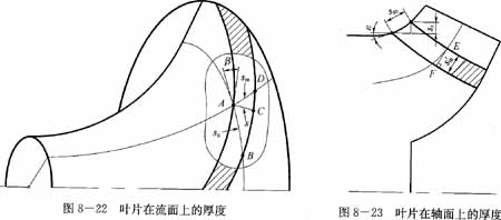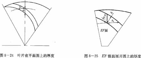 用一個垂直軸面截線的EF線(圖8-23)為母線的錐面去截葉片,并展開在平面上(圖8-25)。因為該面垂直葉片上的線(軸面截線),所以其上反映葉片的真實厚度δ,由此圓錐面上的圓周方向的厚度應(yīng)等于流面上的圓周厚度,由圖8-25