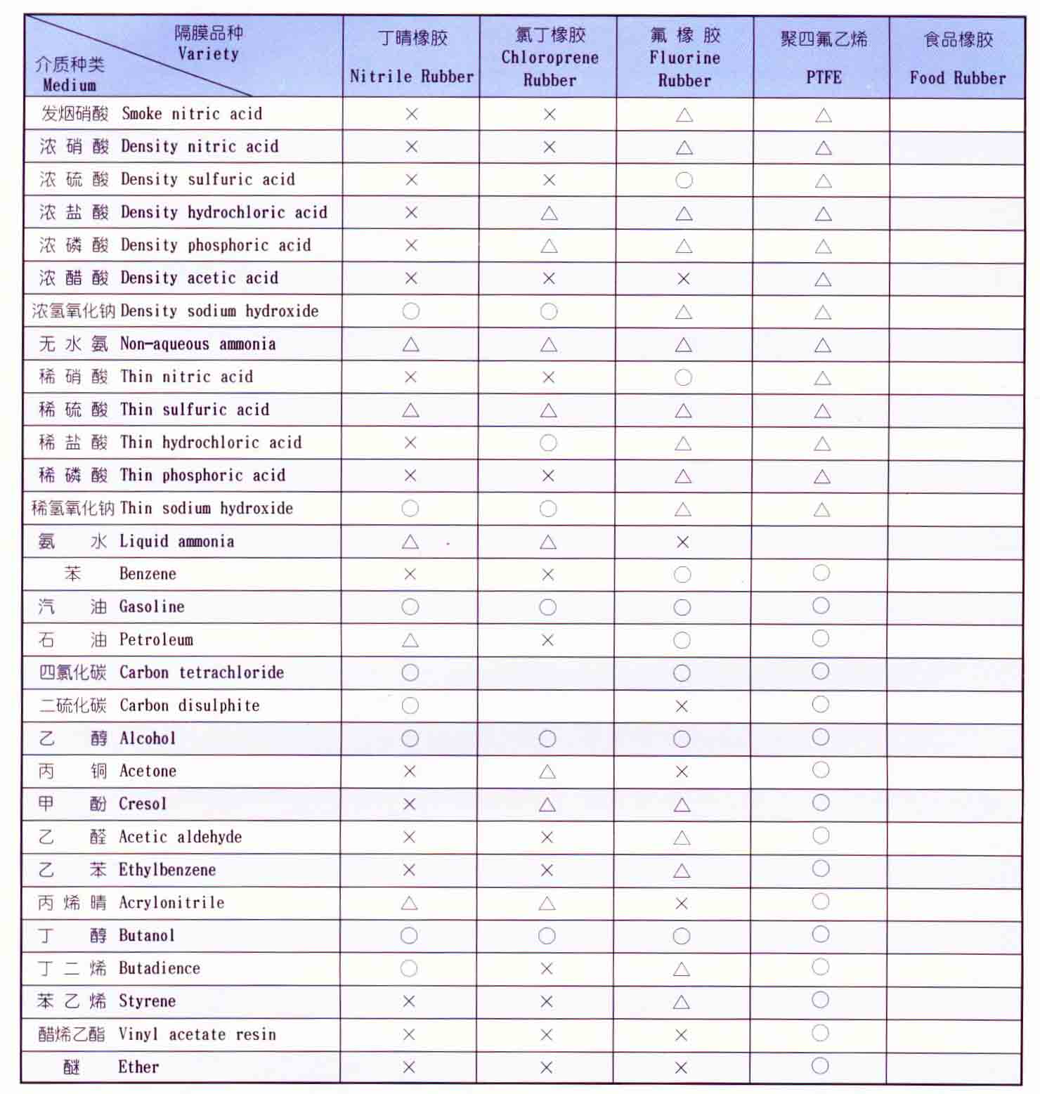 注:○——表示壽命較長;△——表示壽命一般;×——表示不可用。本表僅從耐腐性考慮,因聚四氟乙烯彈性比橡膠差,所以實(shí)際使用壽命因壓力,隔膜泵、行程、雜質(zhì)等因素影響而異。