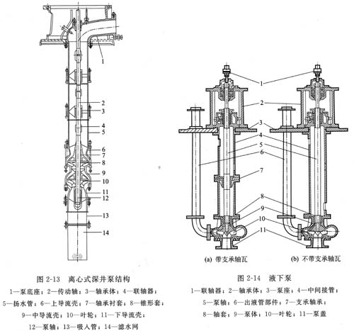 泵的工作部分由一個上導(dǎo)流殼、若干個中導(dǎo)流殼、一個下導(dǎo)流殼和若干個葉輪組成。在各導(dǎo)流殼中裝有橡膠制作的軸承襯套。上導(dǎo)流殼與揚水管相連,揚水管由若干段組成;上一段揚水管與吐出彎管相連。下導(dǎo)流殼與吸人管相連,吸人管下部裝有濾水網(wǎng)。