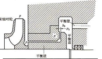 ②采用平衡鼓。如圖2-5所示,為多級泵葉輪后邊裝一圓柱形平衡鼓(又稱為卸荷盤),平衡鼓右邊為平衡室,通過平衡管將平衡室與第一級葉輪前的吸入室連通。因此,平衡室內(nèi)的壓力P0很小,而平衡鼓左邊則為后一級葉輪的背面泵腔,腔內(nèi)壓力p2比較高。平衡鼓外圓表面與泵體上的平衡套之間有很小的間隙,使平衡鼓的兩側(cè)可以保持較大的壓力差,以此來平衡軸向力。當(dāng)軸向力變化時,平衡鼓不能自動調(diào)整軸向力的平衡,但仍需裝止推軸承來承受殘余軸向力。