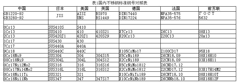 馬氏體不銹鋼的代表鋼號(hào)為1Cr13、2Cr13、3Cr13、4Cr13等,鐵素體不銹鋼的代表鋼號(hào)為1Cr17、1Cr17Ti、 1Cr25等,奧氏體不銹鋼的代表鋼號(hào)為1Cr18Ni9Ti、0Cr18Ni9(304)、00Cr18Ni9Ti(304L)、 0Cr17Ni12Mo2(316)、00Cr17Ni14Mo2(316L)、0Cr18Ni11Ti(321)、0Cr18Ni11Nb(347) 等,雙相不銹鋼的代表鋼號(hào)為00Cr26Ni7Mo2Ti等。