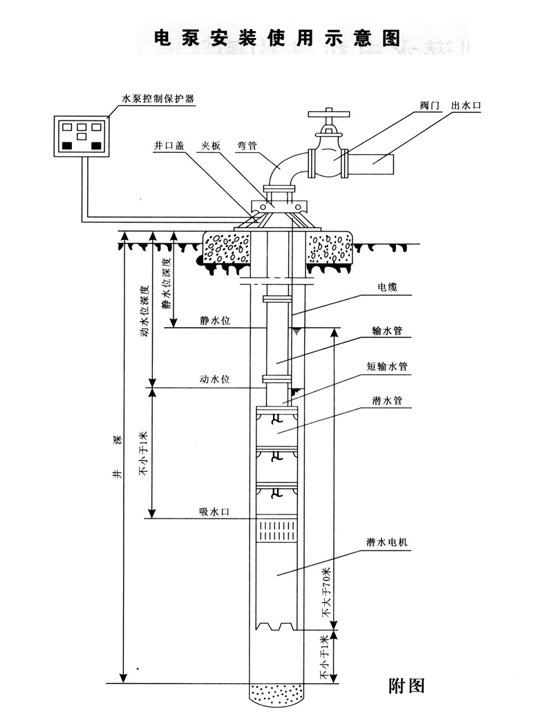 (4)熟悉安裝使用說明書,對新鉆的水井必須進(jìn)行洗井,清除水中泥砂后,方能安裝QJ型潛水電泵。