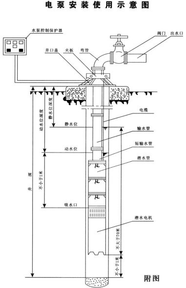四、電動機(jī)必須完全潛入水中,但潛入深度應(yīng)不大于70米。