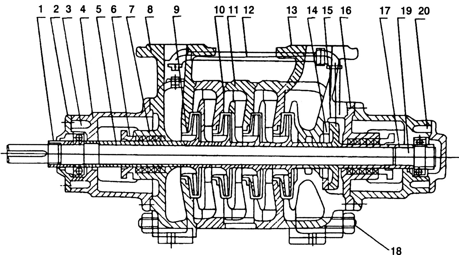 GC型水泵的主要零件有軸、軸套、進水段、葉輪、導翼、密封環(huán)、中段、出水段、平衡環(huán)、平衡盤、尾蓋。