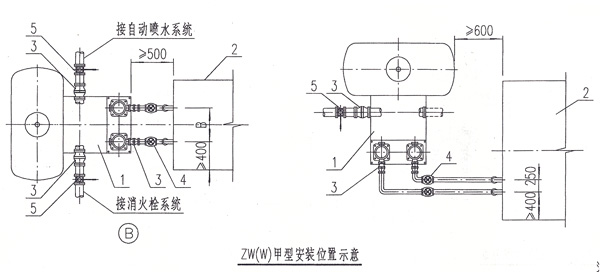 3.本設(shè)備供消防栓和自動(dòng)噴水兩套系統(tǒng)共用時(shí),在其出水管上設(shè)閥門分別與兩系統(tǒng)連接,見圖B所示