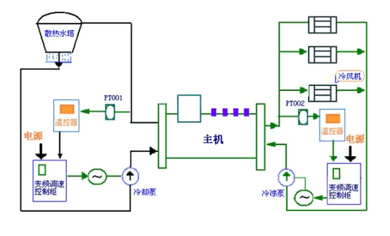 中央空調(diào)系統(tǒng)通常分為冷凍(媒)水和冷卻水兩個系統(tǒng)(如下圖,左半部分為冷凍(媒)水系統(tǒng),右半部分為冷卻水系統(tǒng))。根據(jù)國內(nèi)外新資料介紹,并多處通過對在中央空調(diào)水泵系統(tǒng)進行閉環(huán)控制改造的成功范例進行考察,現(xiàn)在水泵系統(tǒng)節(jié)能改造的方案大都采用變頻器來實現(xiàn)。