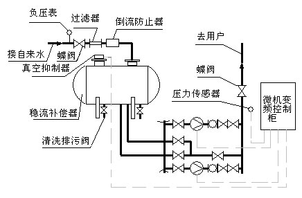 無負(fù)壓管網(wǎng)增壓穩(wěn)流給水系統(tǒng)工作原理圖