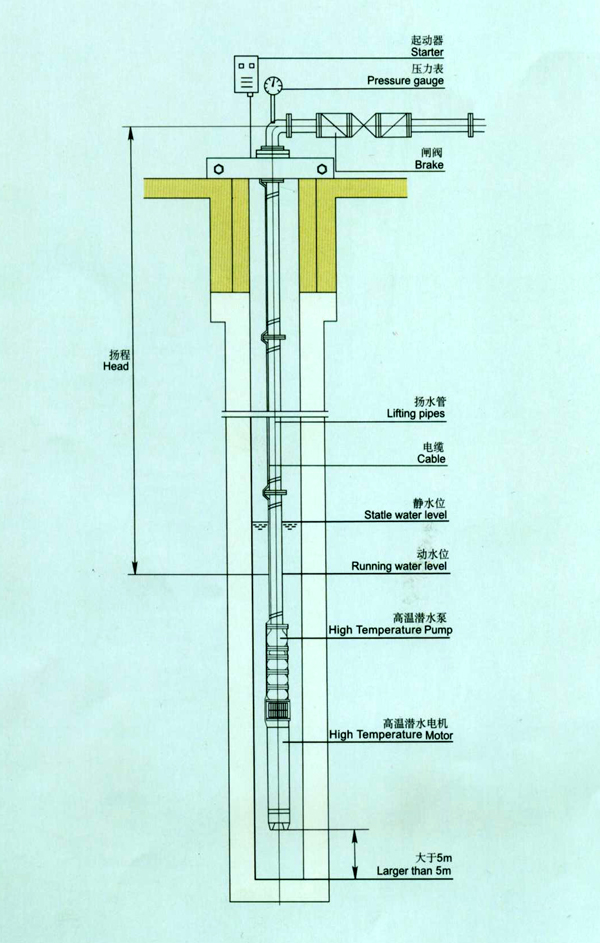 6.機組必須完全浸沒水中工作。立式使用,選擇型號時井陘與泵的型號要匹配,切忌大直徑的徑孔選用小直徑的泵,這樣不利于電機的散熱。