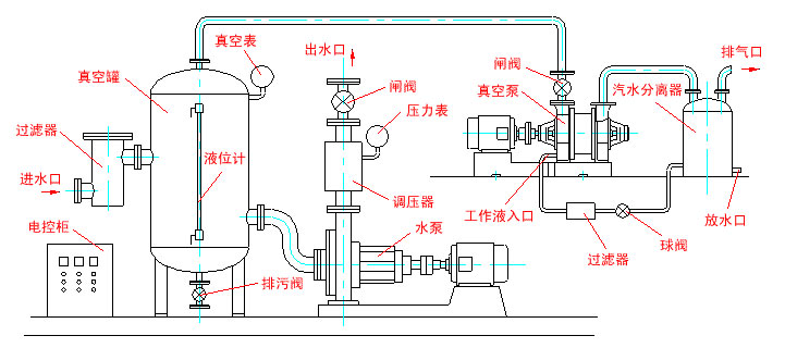 安插在地下的集水管與真空罐入水口相結(jié),當(dāng)真空泵開啟,真空罐內(nèi)達(dá)到額定的真空度時(shí),集水管內(nèi)的存水經(jīng)進(jìn)水過濾器被吸入真空罐內(nèi),當(dāng)達(dá)到一定液位時(shí),水泵開啟,罐體的存水經(jīng)調(diào)壓器排出,從而實(shí)現(xiàn)真空抽水的過程。