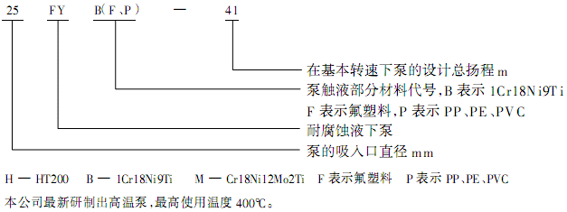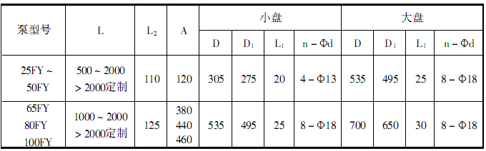 此外,F(xiàn)Y型耐腐蝕液下離心泵系列,因伸入容器長度L的長短不同,則又分為中間導軸承之結(jié)構(gòu)和無中間導軸承的結(jié)構(gòu)。