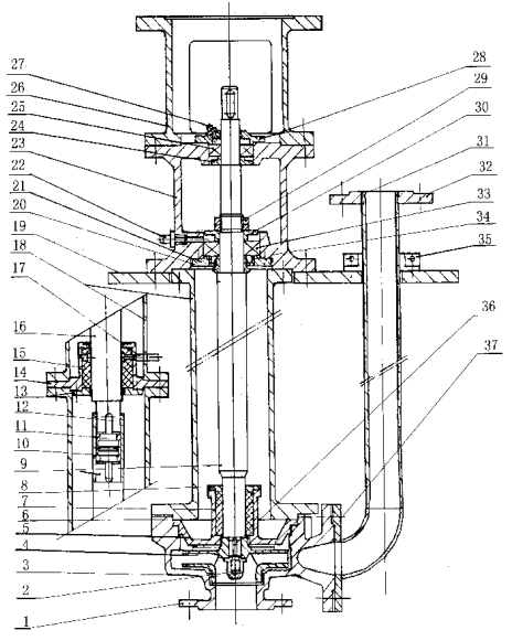 1、 泵體    2、葉輪螺母    3、葉輪    4、墊片    5、泵蓋    6、立柱管    7、導軸管    8、導軸承蓋    9、泵軸    10、傳動套    11、聯(lián)接管    12、鍵    13、中間導軸承壓蓋    14、中間導軸承座    15、中間導軸承    16、泵軸    17、潤滑液管路    18、立柱管    19、支承座    20、甩液套    21、下軸承壓蓋    22、黃油杯    23、軸承座    24、上軸承檔圖    25、軸承    26、電機座    27、黃油杯    28、上軸承壓蓋    29、鎖緊螺母    30、下軸承擋圈    31、出液管    32、出液口法蘭    33、軸承    34、油封    35、對半法蘭    36、鍵    37、墊片    38、下軸承壓蓋