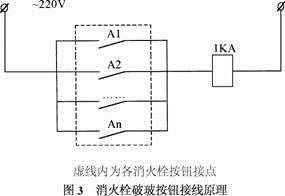 消火栓破玻按鈕操控首要由消火栓破玻按鈕中問繼電器、操控線等組成。它的首要接線辦法有兩種。 第一種接線辦法需求消火栓按鈕運用的額外電壓為220 V,詳細的接線原理見圖3。