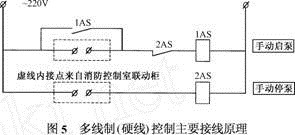 多線制(硬線)操控首要由聯(lián)動操控柜、中問繼電器、操控線等硬件組成。它的首要接線原理見圖5。