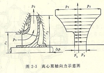 液體以低壓進(jìn)入葉輪,而在高壓下流出葉輪,也就是說,葉輪人口處液體的壓力較低,葉輪背側(cè)的壓力較高,而且由于葉輪前后蓋板形狀的不對稱,使得葉輪兩側(cè)受到的液體壓力不相等,因而產(chǎn)生了軸向推力,如圖2-3所示。這個軸向推力作用在葉輪上,通過葉輪螺母傳遞到整個轉(zhuǎn)子上,使泵的整個轉(zhuǎn)子發(fā)生向葉輪吸人口方向的竄動,引起泵的振動,軸承發(fā)熱,甚至損壞零件。為避免軸向推力的不良影響,圖2 2所示