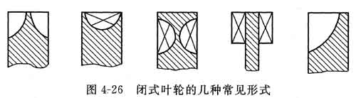 ①閉式葉輪 如圖4-26所示,液體由葉輪的外緣(大直徑處)進入葉輪。具有這種構(gòu)形式的旋渦泵揚程曲線較陡,在相同葉輪圓周速度下?lián)P程為開式泵的1.5~3倍,效率0.3~0.5,體積較小。但汽蝕性能偏低,在沒有附加氣水分離裝置之前沒有自吸能力,不能氣液混輸: