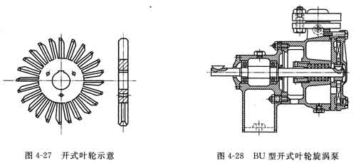 ②開式葉輪 圖4-27所示為常用的開式葉輪,液體自葉輪側(cè)面(小直徑處)進入葉片間,葉片中心線處沒有隔板。具有這種葉輪形式的旋渦泵汽蝕性能較高,可以做成自吸泵和氣液混輸泵,但體積較大,效率低(η=0.2~0.4)。典型結(jié)構(gòu)如圖4-28所示。