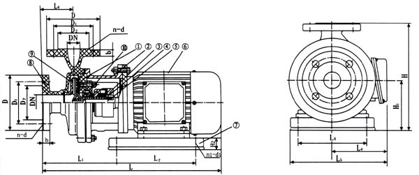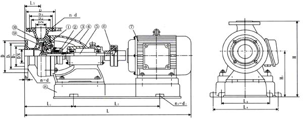 6、如果更換滾珠軸承或泵軸時(shí),必須拆下機(jī)架,松開前端軸承蓋4只螺釘。拆下泵軸后端螺母和聯(lián)軸器,將泵軸向前端方向打出即可,再后拆下后端軸封蓋。