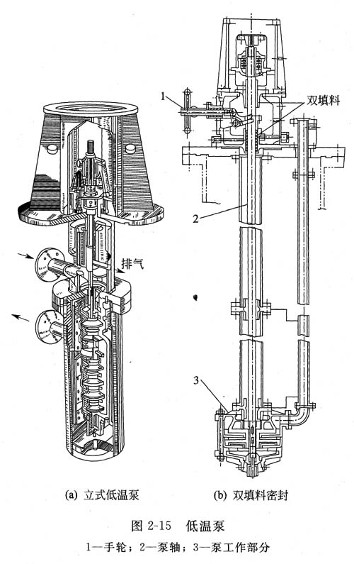 ③低溫泵  圖2-1 5所示為低溫泵的一種形式。這類泵一般用于輸送液化氣體,低溫