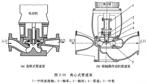 圖2-1 6(a)為直聯(lián)式管道泵。圖2—1 6(b)所示管道泵,以帶有中間連接軸的聯(lián)軸器傳動,在不必拆卸管線和拆除電動機的情況下,即可取出轉(zhuǎn)子組(包括葉輪、泵軸、軸承和軸封等)進行檢修,更適合化工生產(chǎn)特別是大型化工裝置應(yīng)用,加之管道泵占地面積小的優(yōu)點,如按離心式化工流程泵的標準和規(guī)范設(shè)計、制造和檢驗,可發(fā)展成管道式化工流程泵。