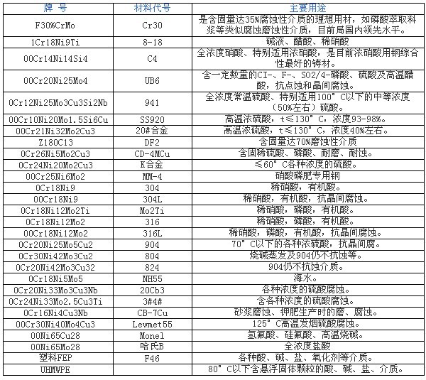 在抗腐蝕材料中,氟塑料具有無(wú)可比擬的優(yōu)異性能,除了熔融堿金屬、元素氟及芳香烴類(lèi)和濃硝酸在170℃以上有腐蝕現(xiàn)象外,在其余各種濃度的鹽酸、硫酸、硝酸、王水、有機(jī)酸、強(qiáng)氧化劑、濃、稀酸交替,酸、堿交替和各種有機(jī)溶劑中均呈 惰 性反應(yīng)。將其內(nèi)襯于泵、閥內(nèi)壁,既克服了氟塑料材料強(qiáng)度低的缺點(diǎn),又解決了泵、閥主體材料抗腐蝕性能差、成本高的不足。另外,氟塑料除了具有優(yōu)異的化學(xué)穩(wěn) 定性外,其防污、防粘性好、動(dòng)靜摩擦系數(shù)值極小且相近,減摩潤(rùn)滑性能良好,將其做為閥門(mén)啟、閉件的密封副,可降低密封面間磨擦力,減小閥門(mén)操作扭矩,提高 產(chǎn)品使用壽命,其使用范圍還可擴(kuò)展到食品、醫(yī)藥工業(yè)。其內(nèi)襯材料除PTFE(F4)、FEP(F46)、PVDF(F2)外,又?jǐn)U展到聚烯烴類(lèi)的PE、PP及PVC范圍,以滿足各種不同工況參數(shù)的需要。我公司氟塑料泵產(chǎn)品主要有兩大類(lèi)型,一類(lèi)為全氟(氟塑料合金)型耐腐蝕泵,(此類(lèi)為小型泵);一類(lèi)為全內(nèi)襯氟塑料(F46)型耐腐蝕泵,(此內(nèi)為大型泵)。