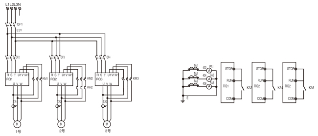 二用一備軟起動(dòng)控制柜應(yīng)用于兩臺(tái)電機(jī)運(yùn)行,另一臺(tái)備用的場合。當(dāng)其中運(yùn)行的一臺(tái)設(shè)備出現(xiàn)故障停機(jī)后,則備用的另一臺(tái)設(shè)備將自動(dòng)投入運(yùn)行,以保證特殊情況下的正常生產(chǎn)。