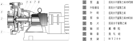 2) 泵體為鋼襯超高分子量聚乙烯結(jié)構(gòu),襯里厚度為8~20mm,該泵應用了襯塑專利技術,和其它同類泵相比較,具有襯里層抗熱變形性能好,耐開裂,防脫落,使用溫度高等優(yōu)勢。