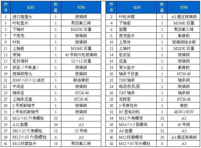 本泵與介質(zhì)接觸的零部件,系用聚乙烯醇縮丁醛改性酚醛玻璃纖維,經(jīng)高溫模壓成型的酚醛玻璃鋼制件,聯(lián)接管、出液管采用半干法卷制工藝制成的酚醛玻璃鋼管,葉輪軸套的裝配均用酚醛膠泥和泵軸粘成一體,液下各部裝配均用酚醛膠泥粘結(jié),伸入液下全無金屬與介質(zhì)接觸,耐腐性能絕對可靠,產(chǎn)品具有輕質(zhì)、高強(qiáng)、不變形、耐溫、耐腐蝕等優(yōu)良性能,在防腐方面可部分替代含鉬不銹鋼、鈦及鈦合金等貴重金屬。