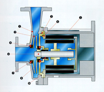 驅(qū)動裝置采用主動磁鐵聯(lián)軸器直接裝在電機(jī)軸上,泵室完全封閉,通過磁力偶合間接驅(qū)動轉(zhuǎn)子組合上的葉輪旋轉(zhuǎn)。