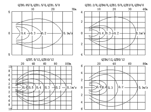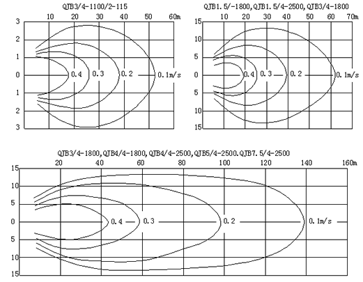潛水?dāng)嚢铏C(jī)的選型是一項(xiàng)比較復(fù)雜的工作,選型的正確與否直接影響設(shè)備的正常使用,作為選型的原則就是要讓潛水?dāng)嚢铏C(jī)在適合的容積里發(fā)揮充分的攪拌功能,一般可用流速來確定。根據(jù)污水處理廠不同的工藝要求,潛水?dāng)嚢铏C(jī)佳流速應(yīng)保證在0.15~0.3m/s之間,如果低于0.15m/s的流速則達(dá)不到推流攪拌效果,超過0.3m/s的流速則會(huì)影響工藝效果且造成浪費(fèi)。所以在選型前首先確定QJB潛水?dāng)嚢铏C(jī)運(yùn)用的場所,如:污水池、污泥池、生化池;其次是介質(zhì)的參數(shù),如:懸浮物含量、粘度、溫度、PH值;還有水池的形狀、水深甚至安裝方式等都對選型產(chǎn)生影響,同時(shí)還應(yīng)考慮到節(jié)能因素,因?yàn)檫@將影響到用戶今后的運(yùn)行成本?蓞⒖枷旅娴臐撍?dāng)嚢铏C(jī)流場圖。